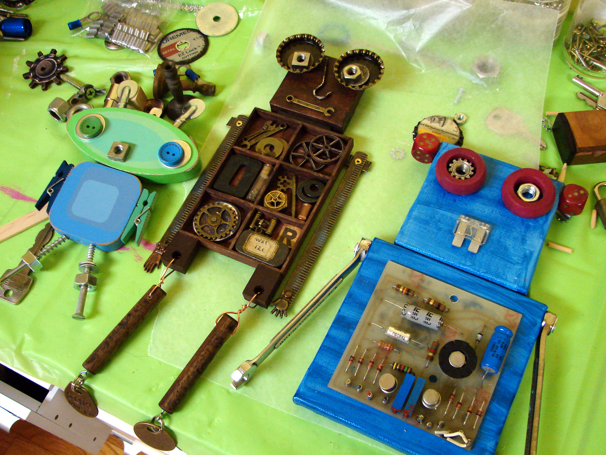 Here’s a sneak peek at what’s under construction at Trilby Works today. Some cute wall hanging found object robots. They are mostly done but the dude on the right needs some legs.