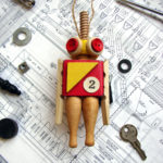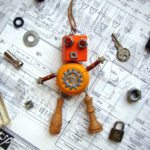 I gathered up all my supplies, which consisted of wood blocks, game pieces, tids and bits of hardware, scrapbooking embellishments, etc. After a few days of intensive gluing, drilling, and assembling, I had a small troupe of the cutest holiday ornaments I’ve ever seen.
