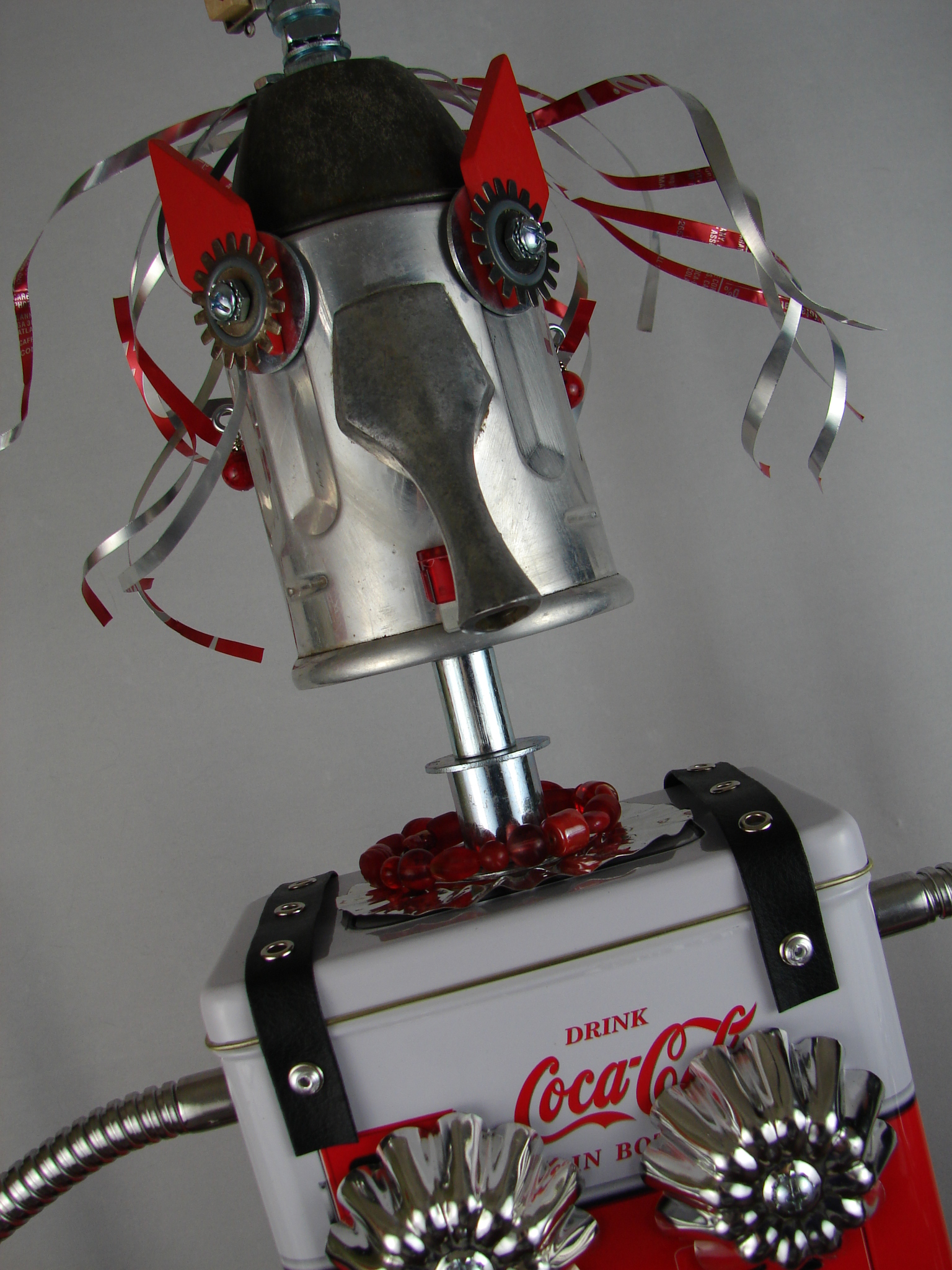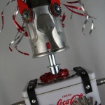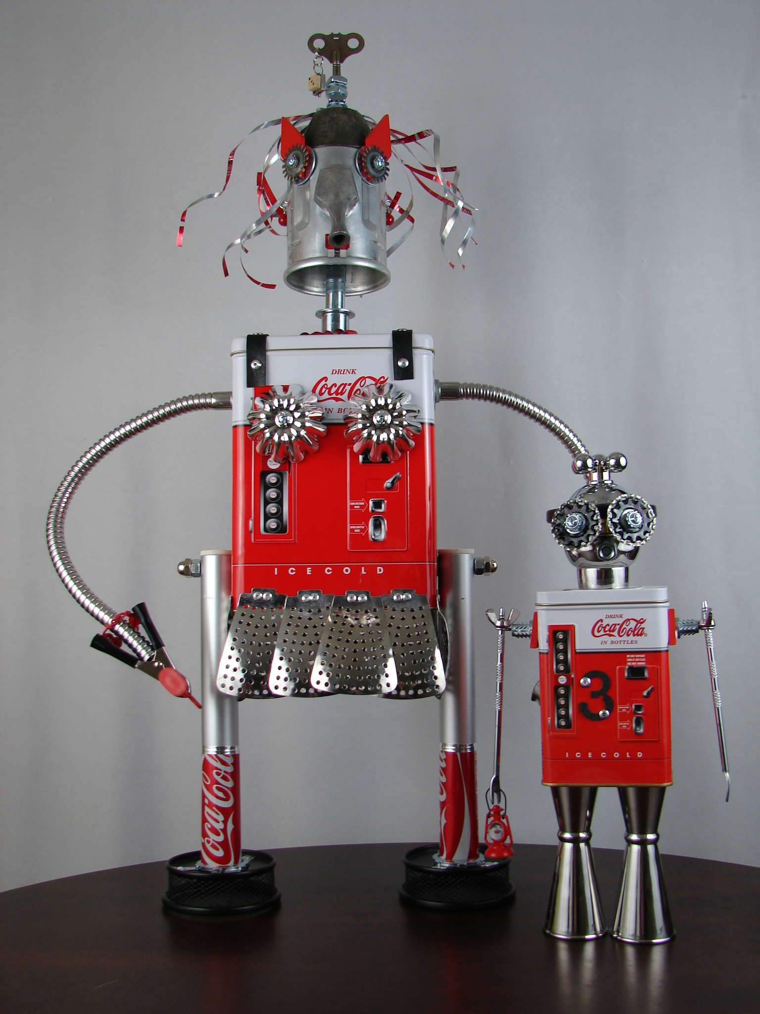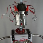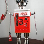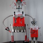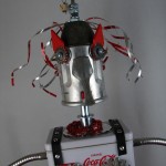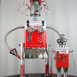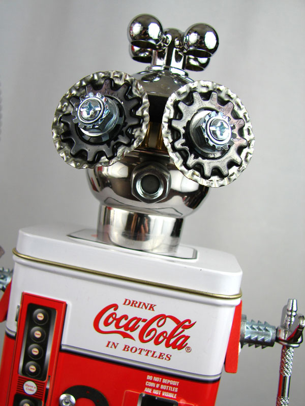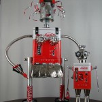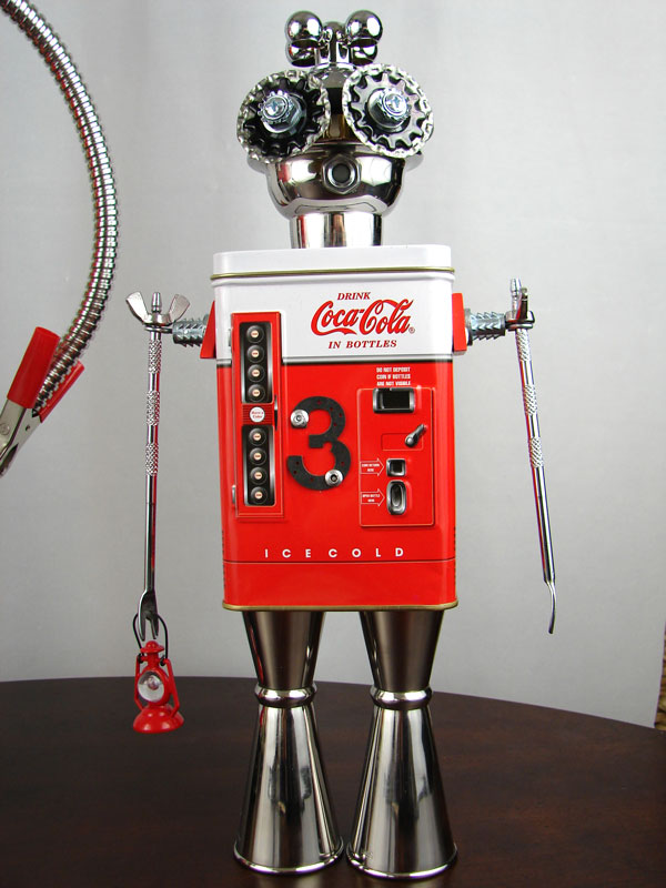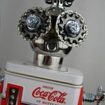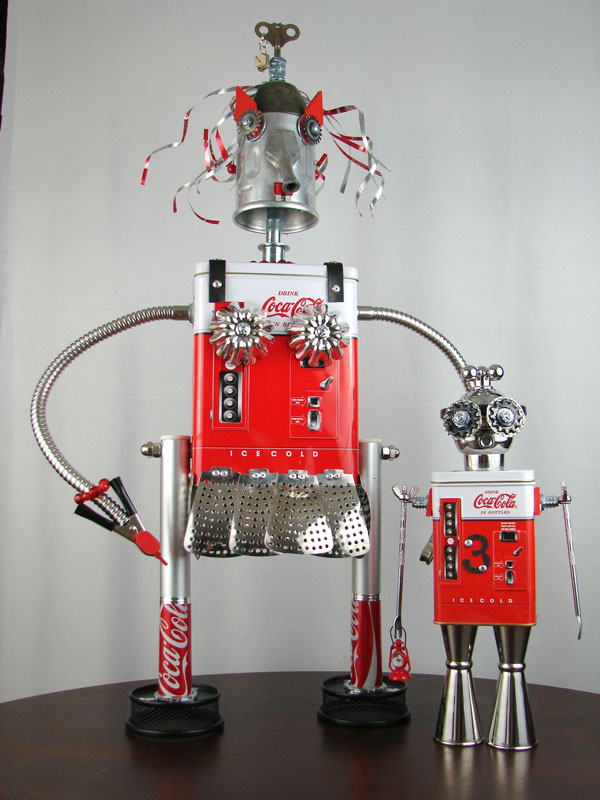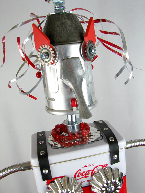 This mama robot comes with a toddler bot so you have an instant family. Made from found objects, the robot bodies are Coke tins. The mama has jelly mold breasts, a vegetable steamer skirt, paper clip tray feet, a coffee pot head, and Coke can hair. Her arms are made from wire and a shower hose with electrical clasps for hands. She wears glass beaded jewelry and clutches a plastic toy in one hand. The toddler’s head is made from resale shop finds with a working timer for a head. His arms are made from lobster forks and his legs are jiggers. He holds a toy lantern in his hand. Both pieces are numbered and signed by the artist.