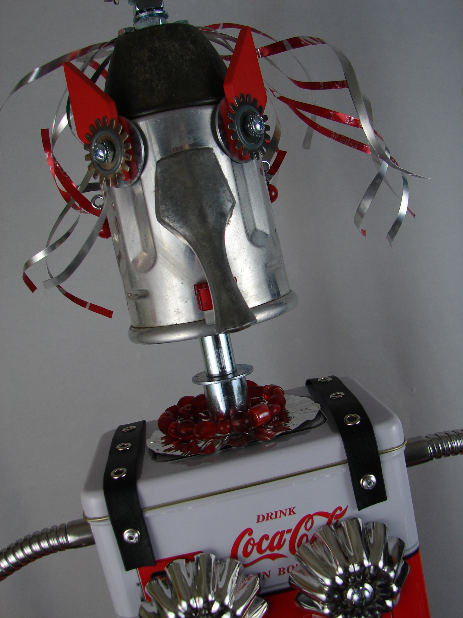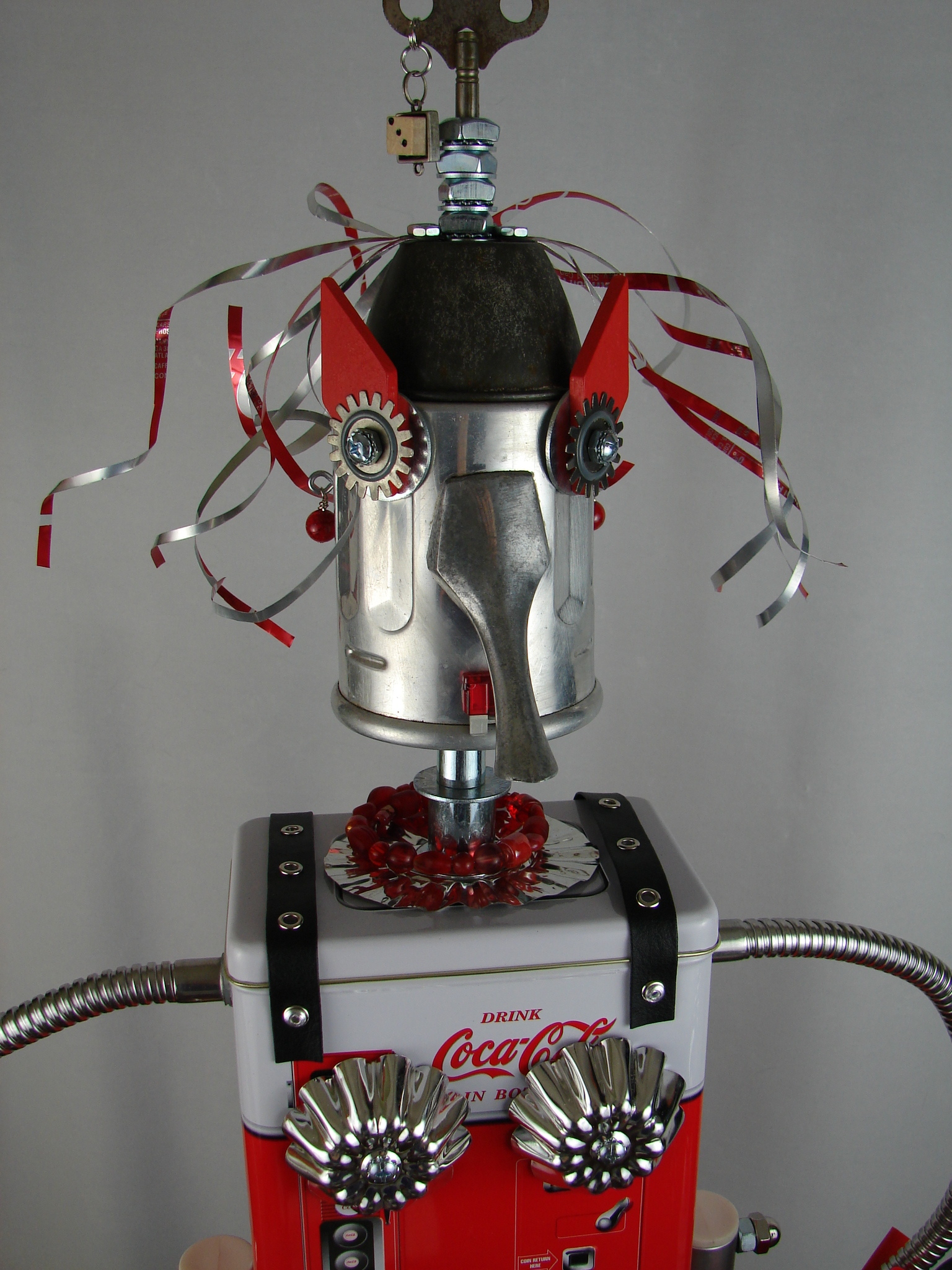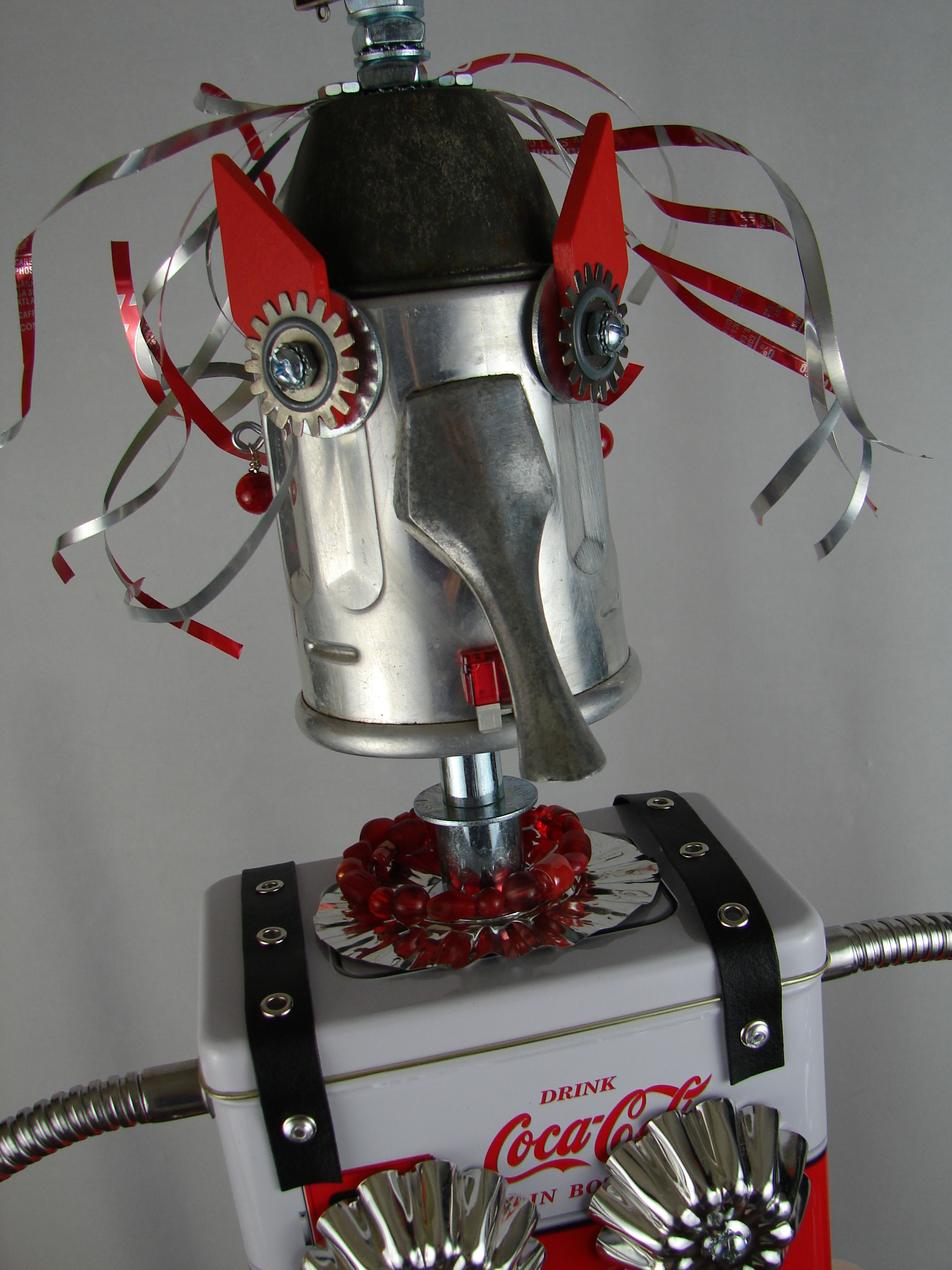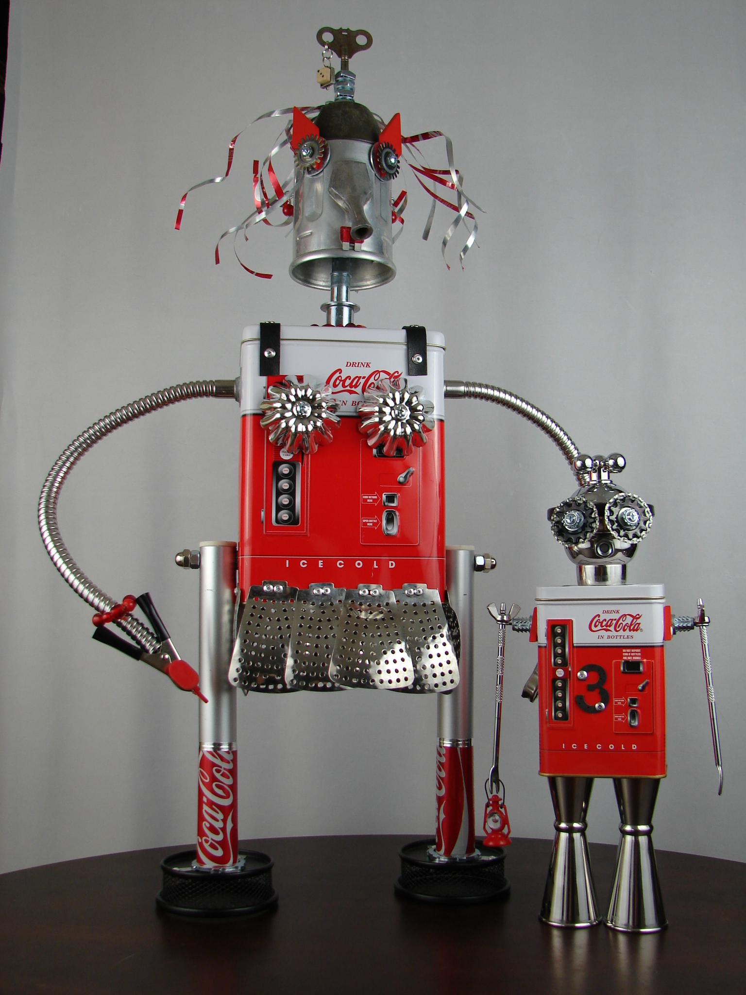 This mama robot comes with a toddler bot so you have an instant family. Made from found objects, the robot bodies are Coke tins. The mama has jelly mold breasts, a vegetable steamer skirt, paper clip tray feet, a coffee pot head, and Coke can hair. Her arms are made from wire and a shower hose with electrical clasps for hands. She wears glass beaded jewelry and clutches a plastic toy in one hand. The toddler’s head is made from resale shop finds with a working timer for a head. His arms are made from lobster forks and his legs are jiggers. He holds a toy lantern in his hand. Both pieces are numbered and signed by the artist.