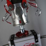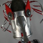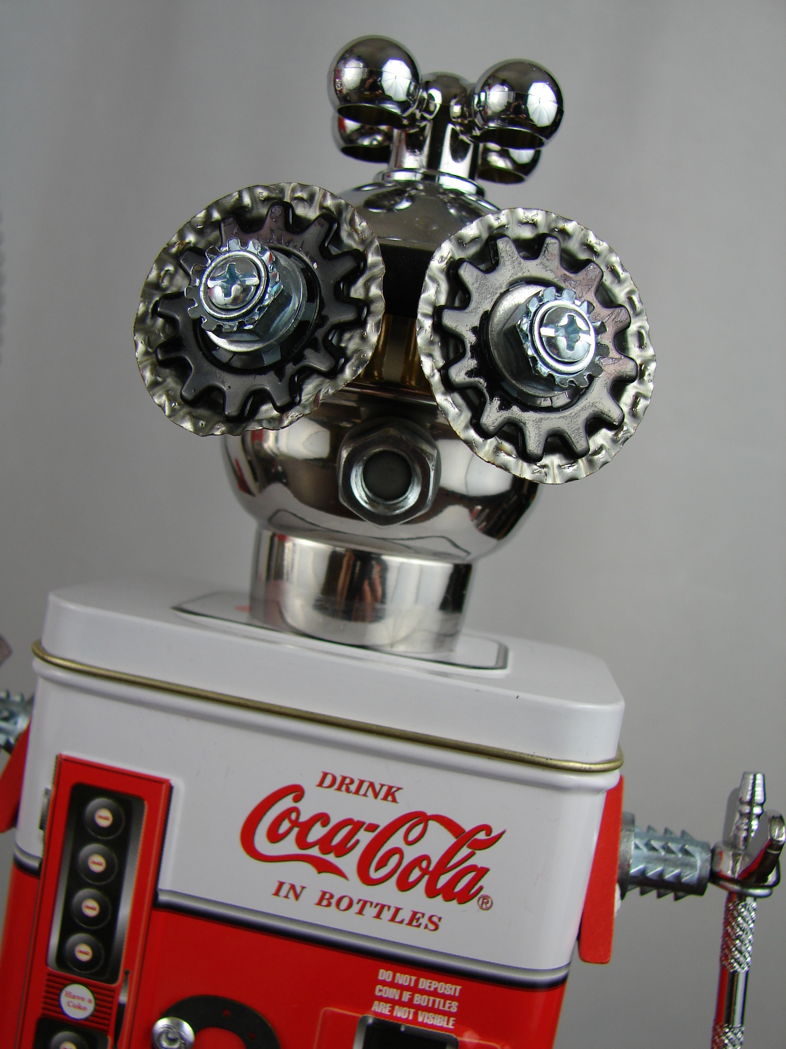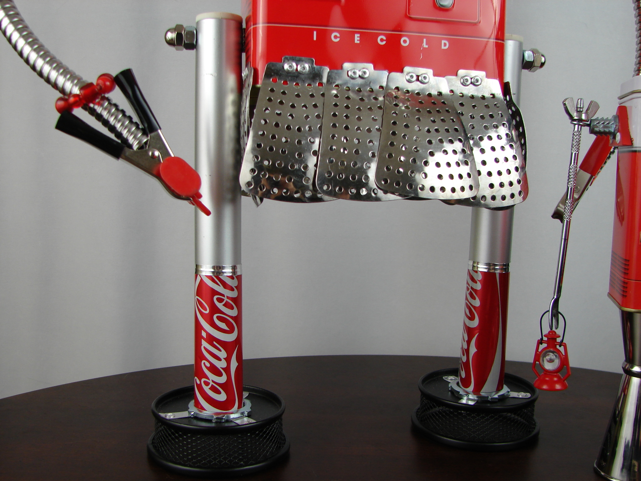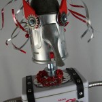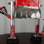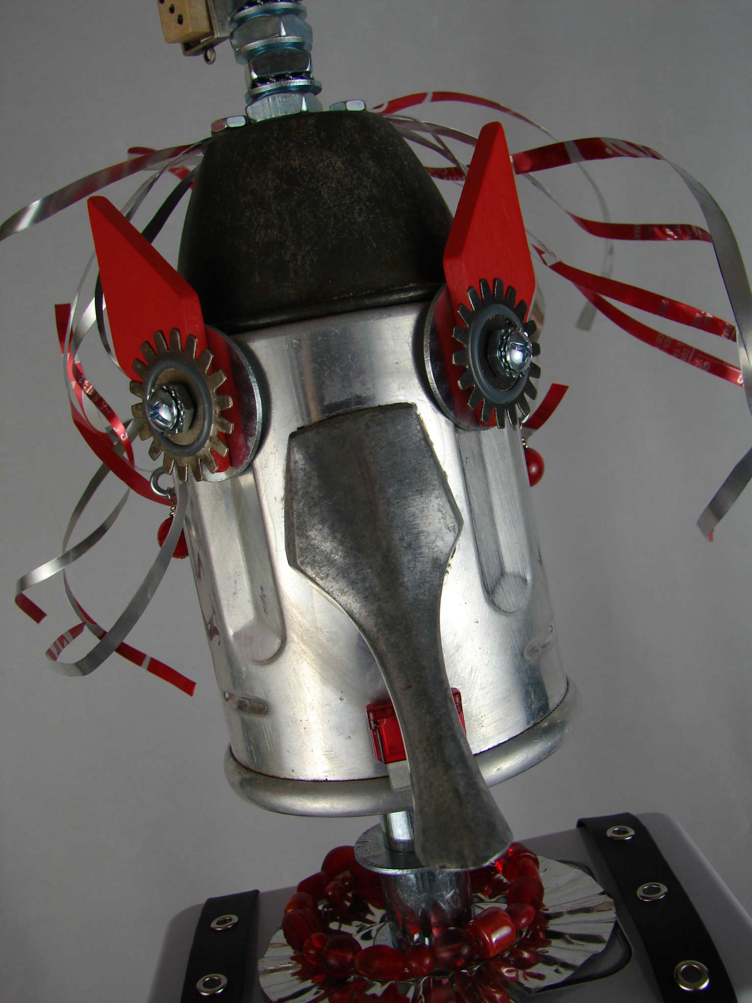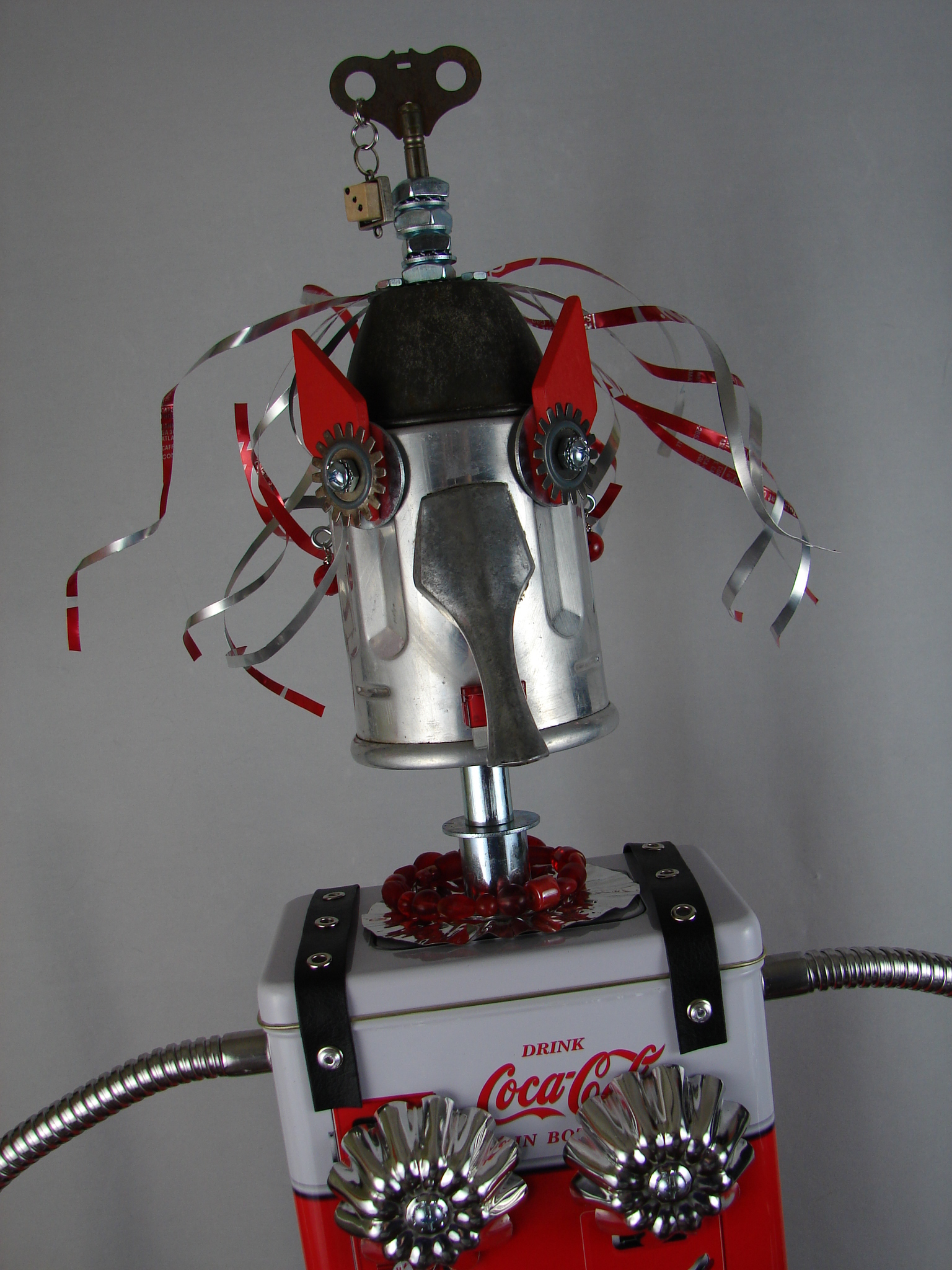 This mama robot comes with a toddler bot so you have an instant family. Made from found objects, the robot bodies are Coke tins. The mama has jelly mold breasts, a vegetable steamer skirt, paper clip tray feet, a coffee pot head, and Coke can hair. Her arms are made from wire and a shower hose with electrical clasps for hands. She wears glass beaded jewelry and clutches a plastic toy in one hand. The toddler’s head is made from resale shop finds with a working timer for a head. His arms are made from lobster forks and his legs are jiggers. He holds a toy lantern in his hand. Both pieces are numbered and signed by the artist.