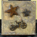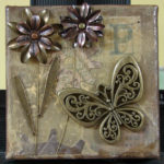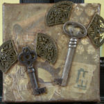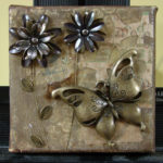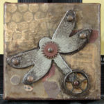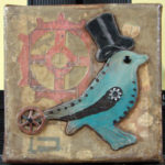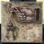 These canvasses were sitting around in my studio for a few years before I finally dusted them off, touched up the paint, and photographed them. I used scrapbooking embellishments, found objects, and jewelry charms. Here they are: