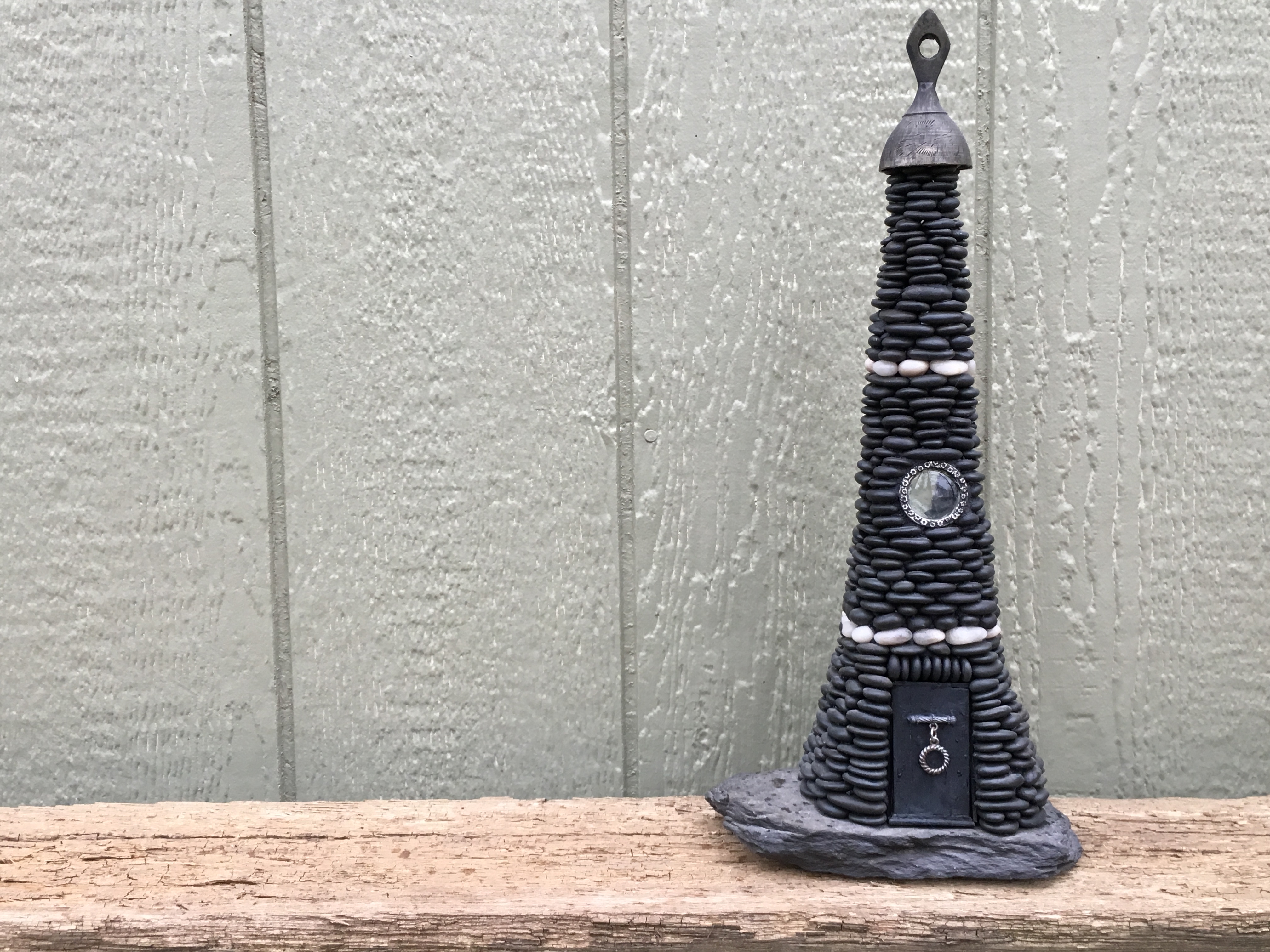 The Ebony Tower fairy house is complete! Laborious layers of stones, glued in place over many months, have finally taken shape into the form of a spiral tower, a sinister home for a dark fae creature.