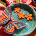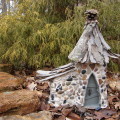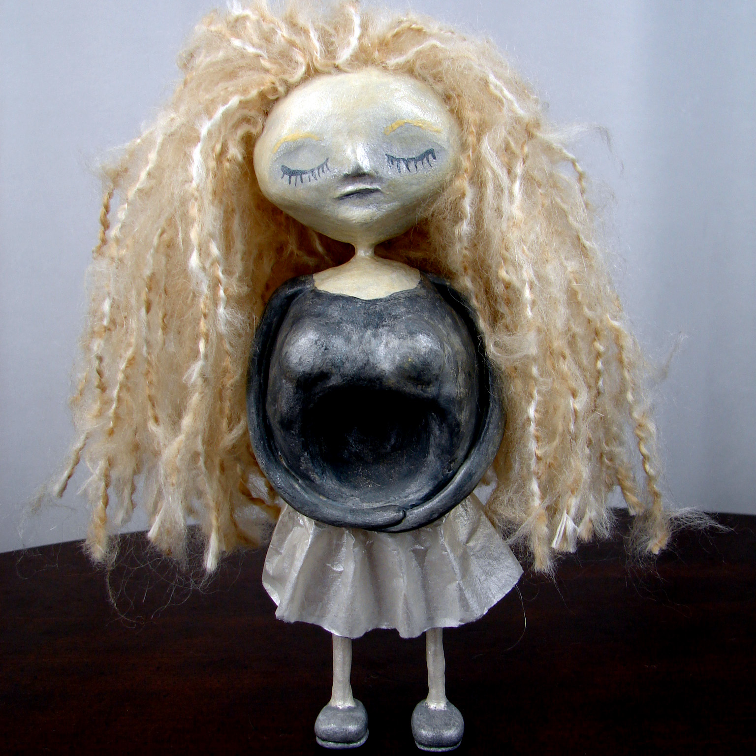 I’ve just completed my first art dolls and I’m unveiling them here first! They are made from paperclay with styrofoam balls and wooden dowels as an armature. They have yarn hair and coffee filter skirts. The large empty hole in her middle of the first one is her barren womb. The second one is missing a breast. Yes, they are expressions of my own grieving for various issues. I call them my Sorrowful Sisters.