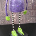 The body is made from a wine bottle cork glued to the lid of creamer bottle and covered with a layer of paper clay. Candy stirring sticks are hot glued to the inside of the creamer lid and reinforced with clay. The head and feet are made from polymer clay. Arms are made from wire inserted through the shoulders and covered with paper clay. His scarf is a piece of felt sewn with glass beads.